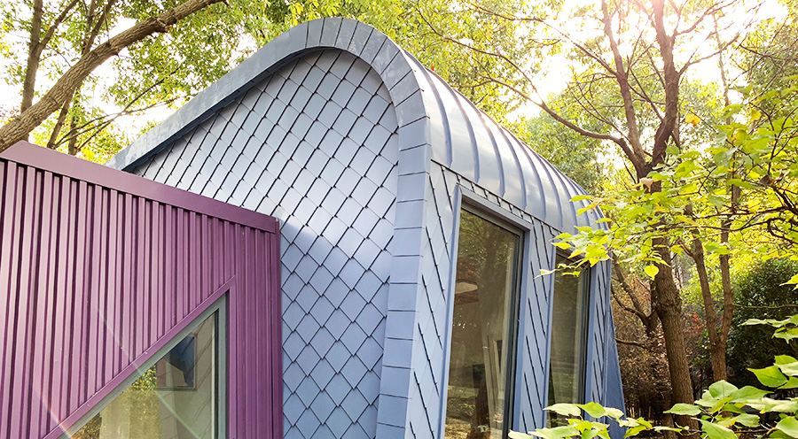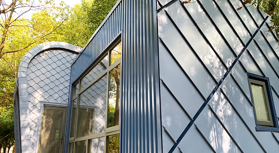 在歐美國(guó)家已普遍使用的鈦鋅板屋墻面系統(tǒng),通常使用環(huán)境友好型的鈦鋅、鈦、鋁、和鋁鎂錳等高級(jí)金屬材料,板型有直立鎖縫,伯爵板,梯形板,菱形及平鎖扣瓦片等系統(tǒng);而焊接直立鎖縫屋面系統(tǒng)則首選不銹鋼材料。鈦鋅板的使用壽命長(zhǎng),自愈功能強(qiáng),環(huán)境友好,低維護(hù)率。原材料也可選彩涂鋼板,性價(jià)比極高,但對(duì)板型有一定影響。