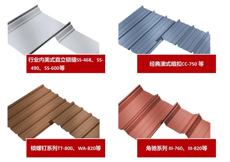 鋼之杰自助研發(fā)的專利夾具可適用于市場(chǎng)上95%的屋面系統(tǒng),如:美式直立鎖縫360°咬邊系列、鎖螺釘系列(T型)、角馳型等。